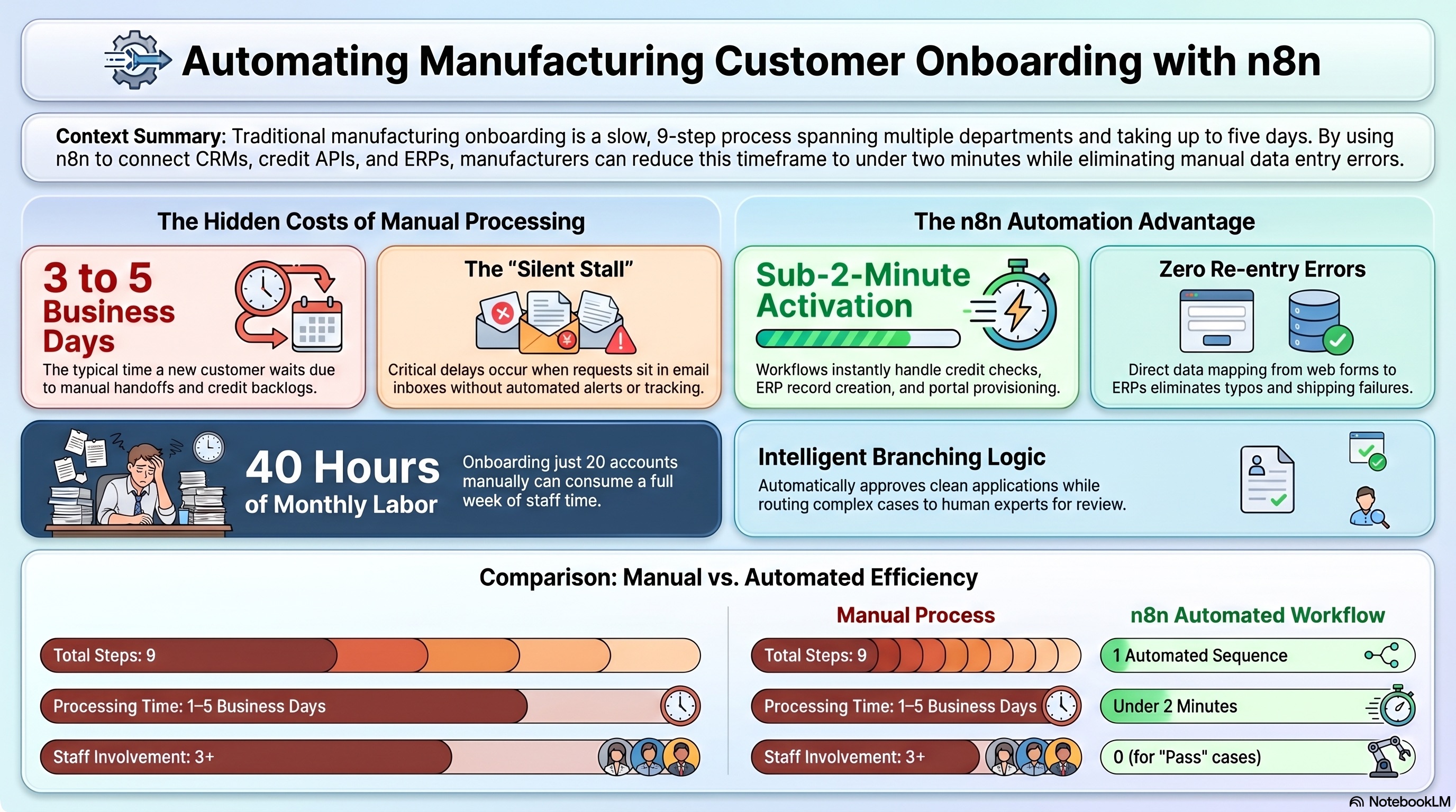 Most manufacturers treat new customer onboarding as a back-office task. Someone receives the account request. They pass it to credit. Credit reviews it. Someone creates the ERP record. Someone assigns the pricing tier. Someone provisions portal access. Someone sends a confirmation.