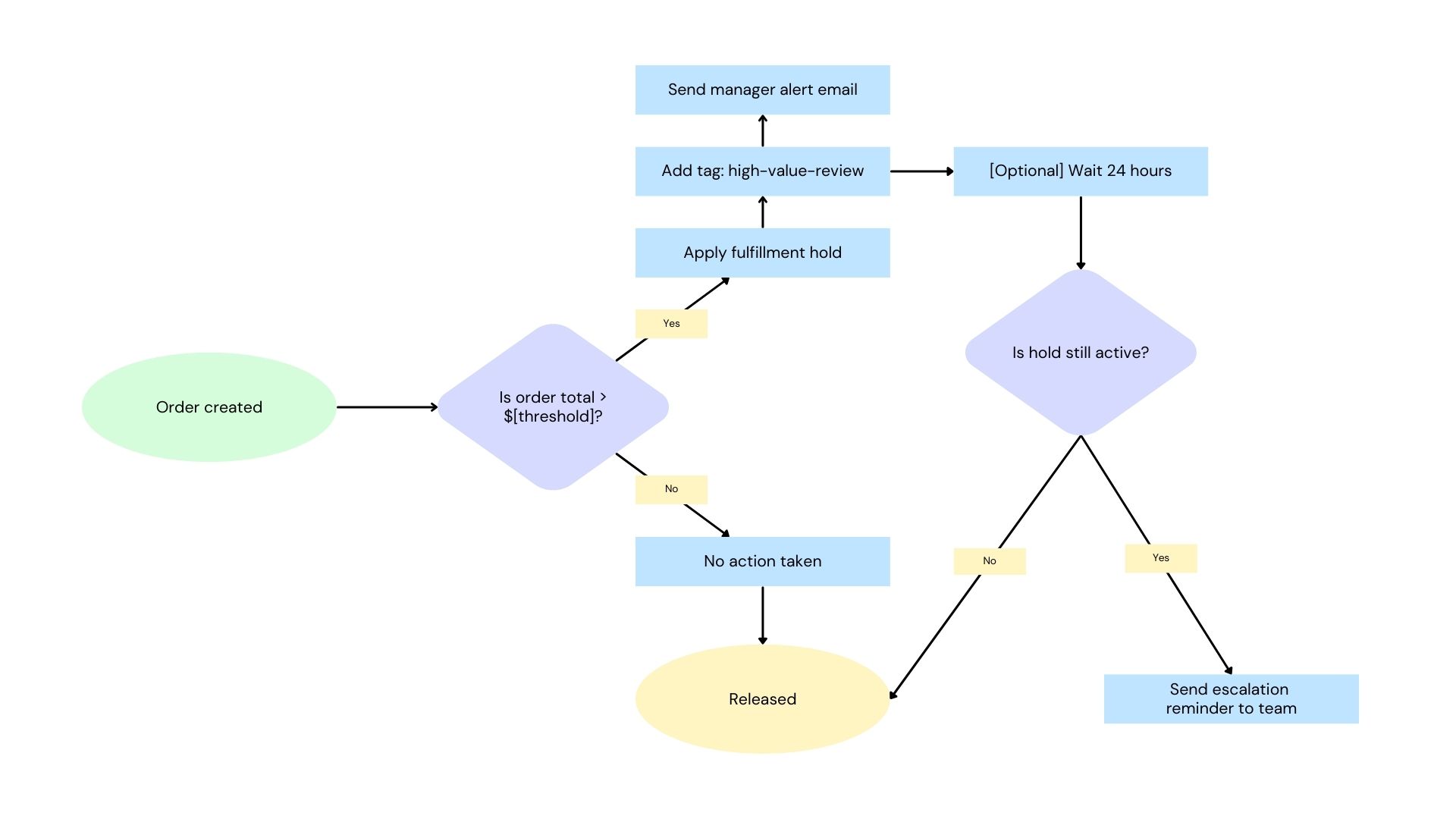 The workflow has a single decision point: is this order above the threshold? If yes, a fulfillment hold is applied and the team is notified. If no, the order passes through normally without any intervention.
