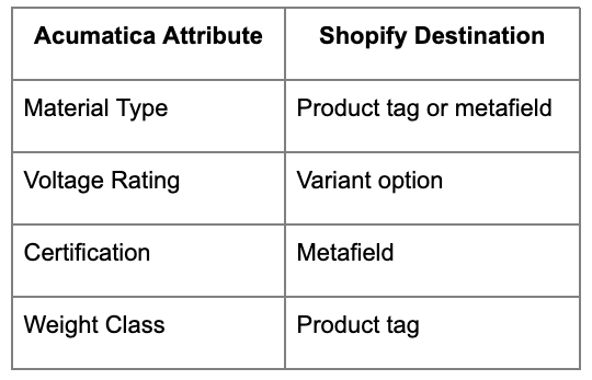 Product attributes in Acumatica can map to Shopify product fields, variants, or metafields.